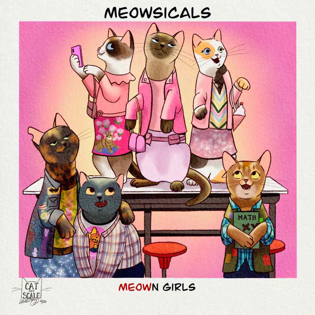 This collection of illustrations combines two of my favorite things: musical theater and cats. Nicknamed “Monday Meowsicals” on my Instagram, a new musical parody featuring cats will be uploaded every Monday. Titles of shows feature silly feline puns.