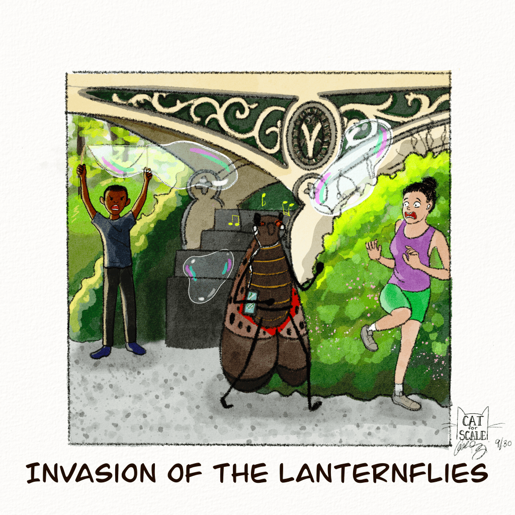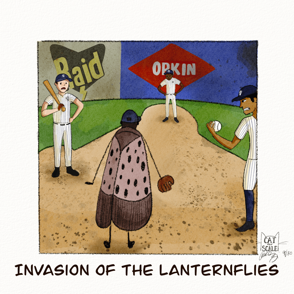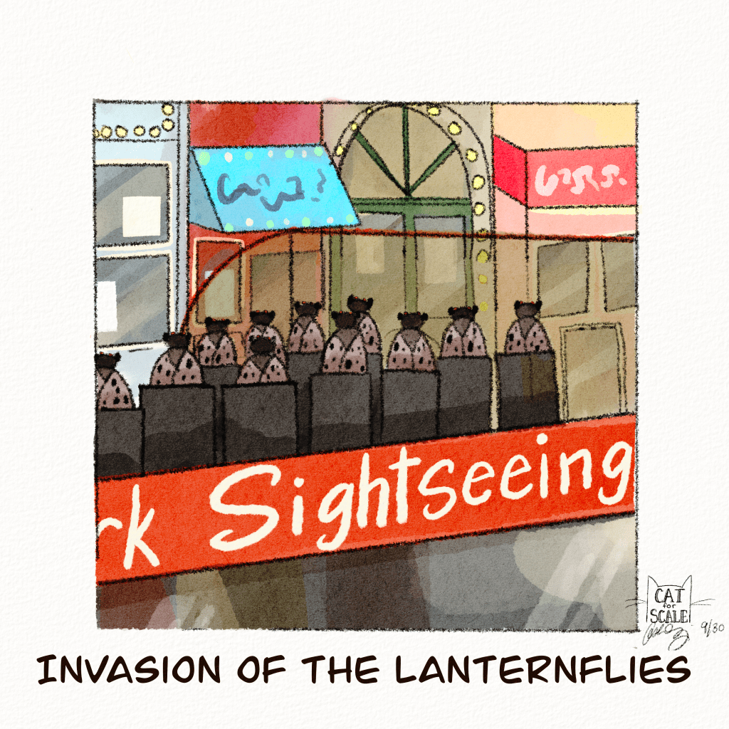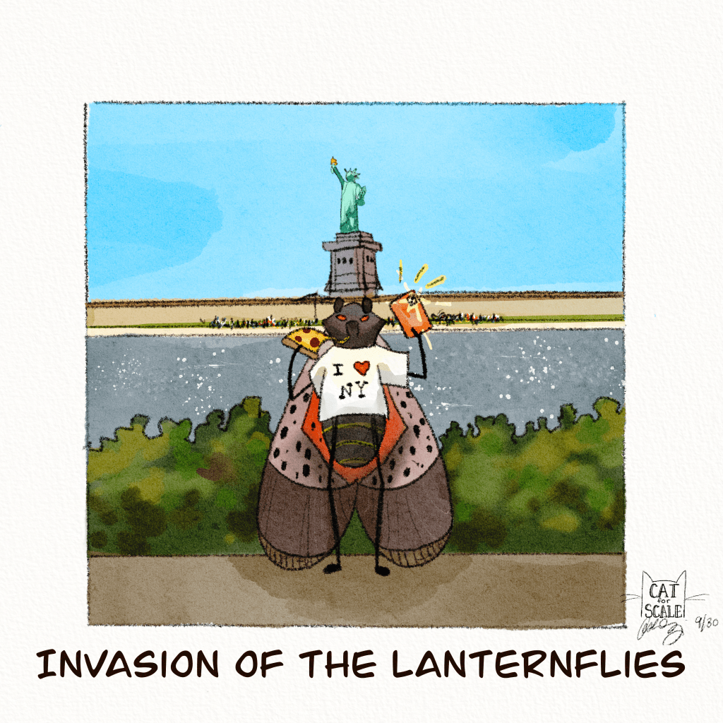 This humorous series of cartoons show invasive and annoying spotted lanternflies making their home in New York. We had two trees-of-heaven cut down in our back yard because they were covered with these things. These lanternflies have jumped onto my own face. Thank goodness my mouth was closed.